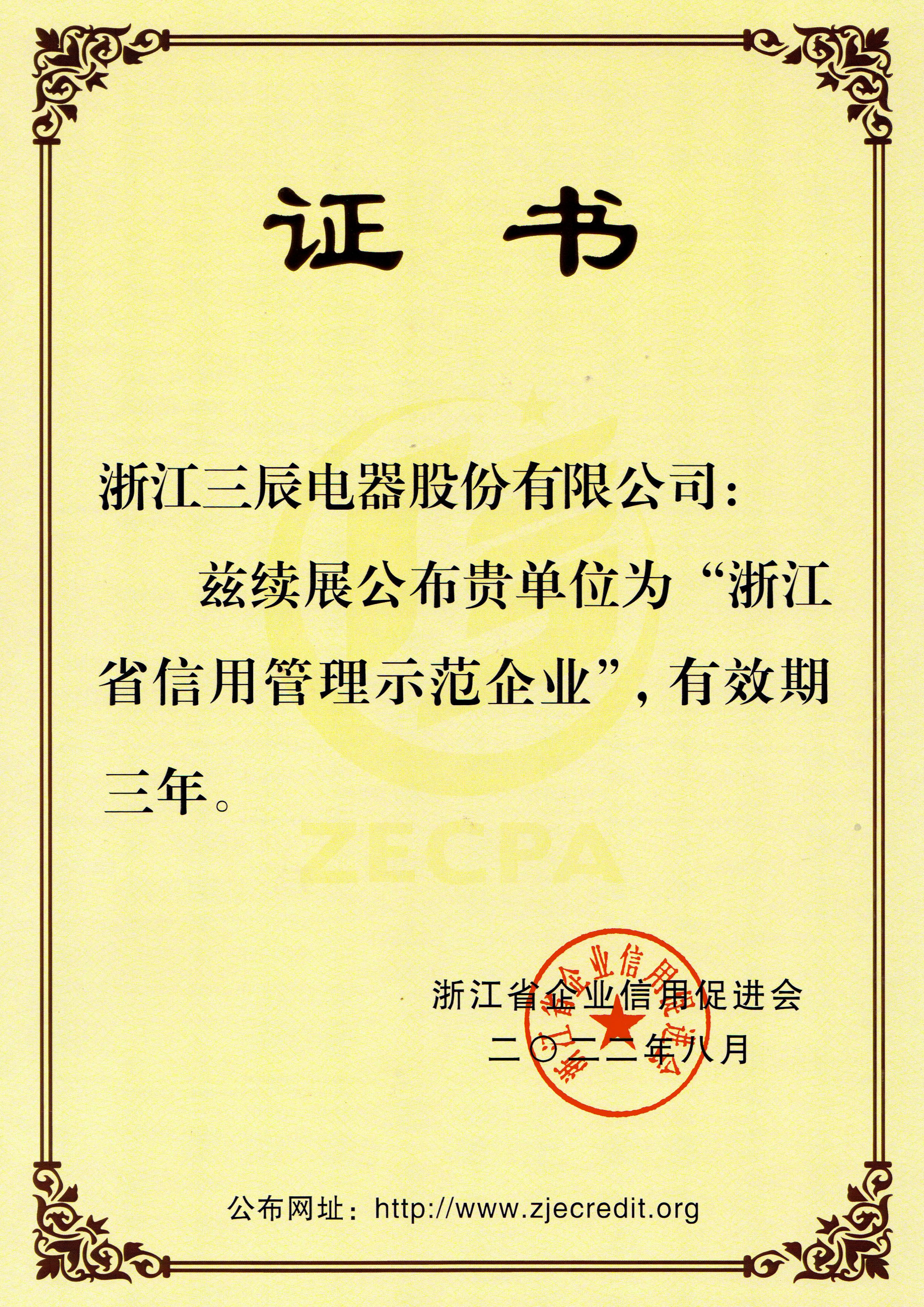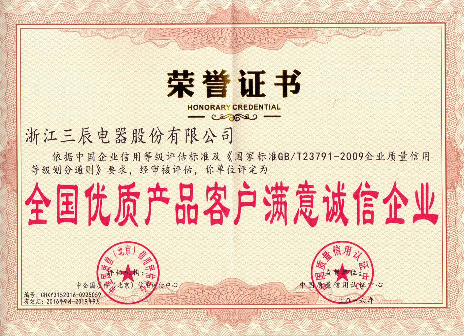 九十年代以来,企业获得原机械部和电力部“低压成套开关设备生产秩序与产品质量整顿”合格证书;企业先后获得“ ISO9001:2000 质量体系认证”,“产品质量认证”,“ ISO14001 : 2004 环境管理体系认证”,“采用国际标准合格证书”,“ '97 采购浙江首选品牌”,“ PGD2 产品全国星火项目金奖”,“ PGD6 程控高频开关电源直流屏 2000 年获电力部和浙江省科技进步三等奖”,“ PGD2 和 PGD5 及 PGD6 型产品获国电公司产品质量部门确认为采用标准国内先进水平”,“ PGD 型省级高质量科技产品”,“ SCPG 型省级高质量科技产品”,“ PGD6 、 PGD7 省级高新技术产品”等证书, SCWZ 综合自动化系统被列为省技术创新项目, PGD 型直流电源设备列入《第二批全国城乡电网建设与改造所需设备主要设备产品及生产企业推荐目录》之中。此外公司还获得“电力工业部归口管理企业”,“中国化工装备总公司定点生产单位”,“行业经济效益评价”及“浙江省高新技术企业认定证书”等,公司多次被评为省级“重合同守信用”单位,成为浙江省首批“诚信企业”,2003 年 3 月公司被授予“全国守合同重信用企业”及“浙江省工商企业信用 AAA 级单位”,“浙江省重质量、守诚信”示范单位。 2004 年 1 月“三辰”商标被评为“浙江省著名商标”,产品被评为名牌产品,2007年10月被授予全国“质量、信誉双保障示范单位”,成为国家级火炬计划项目企业。